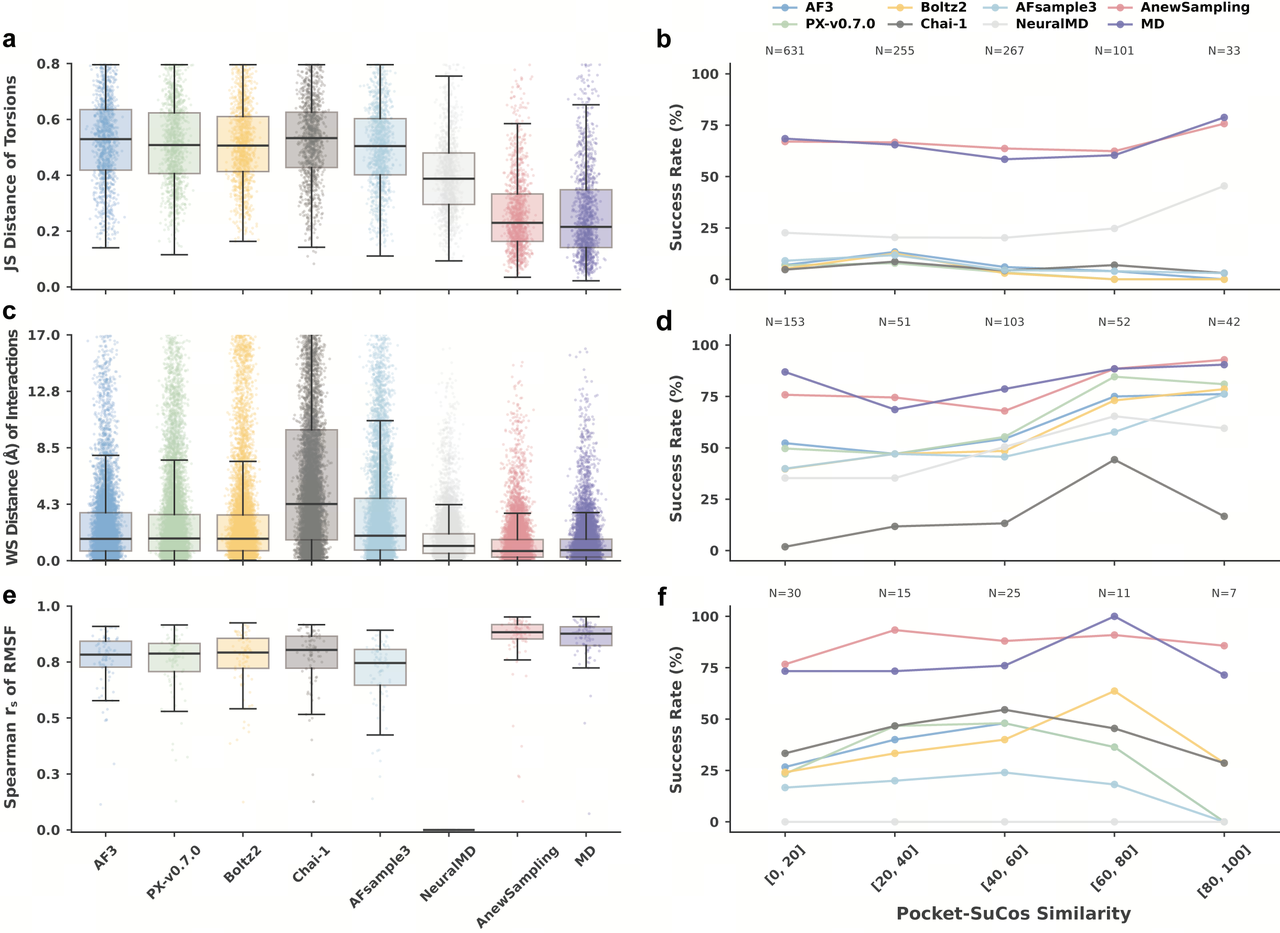 Across an internally constructed test set, the public JACS and Merck benchmarks, and the large-scale protein dynamics dataset ATLAS, AnewSampling demonstrates superior performance.
