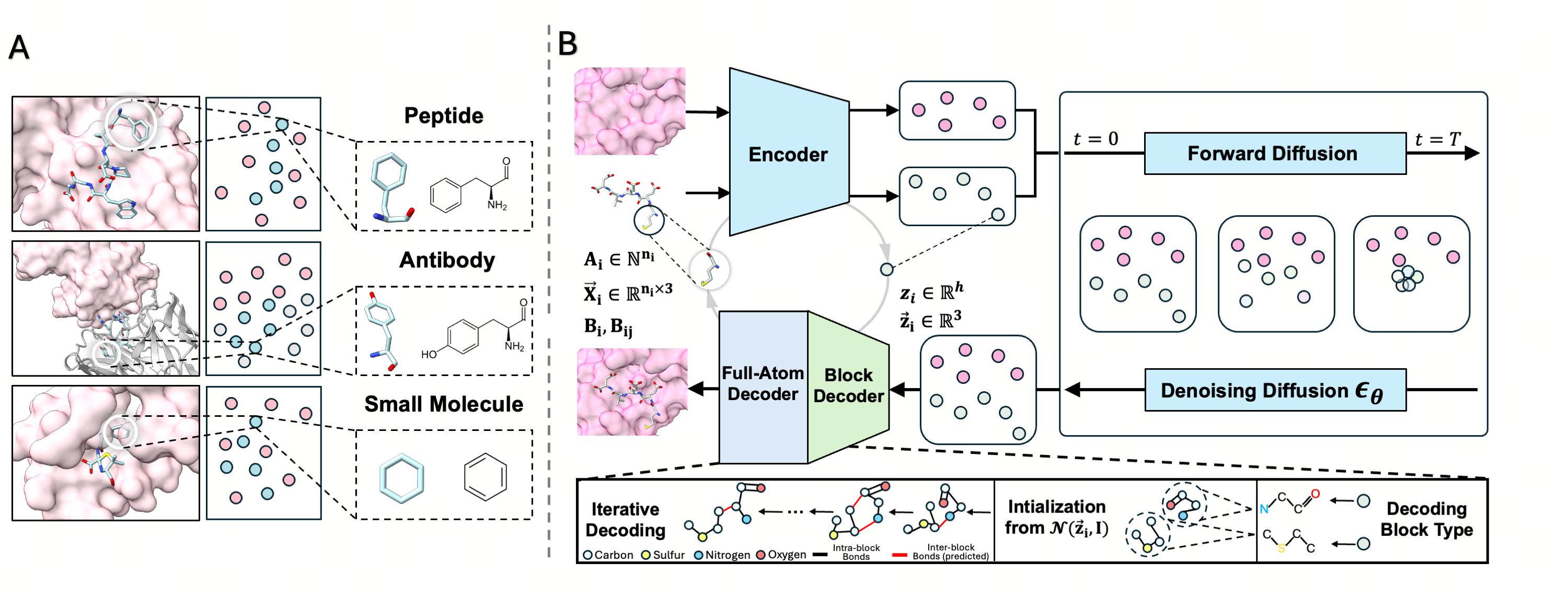 The core innovation of UniMoMo is its ability to process different biomolecular using a unified, full-atom representation called “graphs of blocks.” In this system, a block corresponds to either a standard amino acid (for peptides and antibodies) or a molecular fragment (for small molecules) identified via a principal subgraph algorithm. This representation preserves critical full-atom geometric details while capturing hierarchical structural priors. To generate new binders, the framework employs a geometric latent diffusion model. The process begins with an iterative full-atom variational autoencoder (VAE), which compresses the “blocks” into a latent space defined by low-dimensional hidden states and spatial coordinates. An E(3)-equivariant diffusion model then operates within this compressed latent space to generate the binder’s structure. This latent-space approach allows the model to focus on global structural arrangements efficiently, while a specialized decoder reconstructs the fine-grained atomic details and chemical bonds.